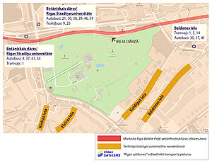 Lai nokļūšana līdz dārzam būtu ērtāka, aicinām izmantot sabiedrisko transportu. Remontdarbu laikā privātās automašīnas iespējams īslaicīgi novietot apkārtējās ielās, pēdējo ceļa posmu līdz dārza ieejai (aptuveni 7–10 minūtes) veicot kājām. Tāpat uz dārzu iespējams doties ar velosipēdu – arī būvdarbu laikā, kamēr vēl tiek ierīkots veloceliņš. Dārza teritorijā pieejamas velosipēdu novietnes, kur var atstāt savu braucamo.